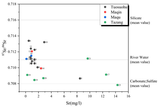 Springs No. 1, 2, 3, 4, 8, 12, 15, 16, and 21, near rivers and sinkholes and belonging to the Quaternary system, are characterized as descending springs with potential replenishment from the surrounding shallow waters. Therefore, they are situated close to the river water depicted on the map. On the other hand, the Tuosuohu, Maqin, and Maqu sections contain high amounts of silicates and low amounts of carbonates. As a result, in the remaining hot springs, such as those in Tuosuohu and Maqin, the 87Sr/86Sr ratios predominantly ranged between 0.711 (river water) and 0.716 (silicate), as observed in the springs numbered 6, 7, 10, 11, and 13. Notably, the Sr concentration of the Tazang water samples was concentrated between 0.708 and 0.711. The highest Sr concentration was observed in the Tazang section, which can be attributed to the groundwater flowing through a significant amount of limestone in that area. Additionally, the presence of multiple faults, such as the GDNF and the GDBF, in this section increases the contact area between the groundwater and the rock.