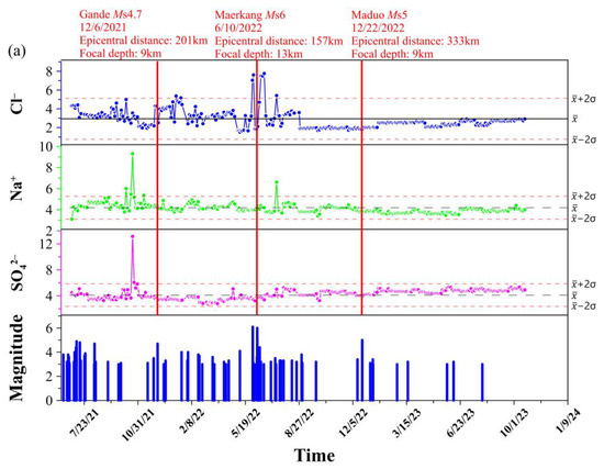 Na+, Cl−, SO42−, Ca2+, HCO3−, K+, and F+ have been identified as sensitive indicators of earthquakes [12,20,70,71,72]. However, Ca2+ and HCO3− are prone to precipitation, K+ can be easily adsorbed by soil, and the F− concentration is below the detection limit. Thus, only Na+, Cl−, and SO42− were used to monitor earthquakes in this study.