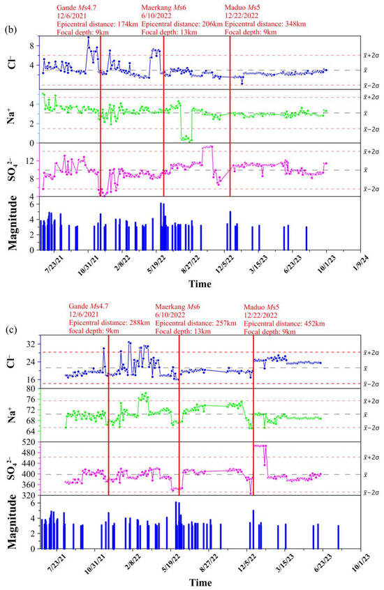Temporal variations in the concentration of Cl−, Na+, and SO42− related to earthquakes. (a) The Maqu spring (EKF 17); (b) the Maixi spring (EKF 19); and (c) the Jiulongxia spring (EKF 23).
