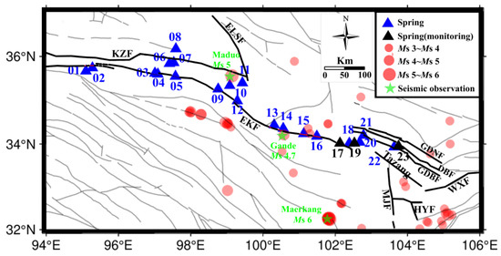 This paper analyzes three regional earthquakes that occurred during the monitoring period in the Eastern Kunlun Fault region: the Gande MS 4.7 earthquake on 6 December 2021, the Maerkang MS 6.0 earthquake on 10 June 2022, and the Maduo MS 5.0 earthquake on 22 December 2022 (see Figure 10). These earthquakes were characterized by shallow hypocenters, significant magnitudes, and their proximity to the regularly monitored springs.