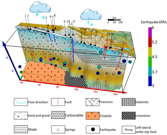 Springs are a window to deep crustal changes [1]. A seismically active fault provides upwelling conduits for fluids in active tectonic settings [1,2,3]. The distribution and properties of the fault systems significantly control the depth and geochemical composition of the circulating fluid [4,5,6]. Furthermore, stress accumulation, changes in stress state, and variations in thermal dynamic conditions can alter the balance of water–rock systems [7]. In recent years, the research has increasingly focused on investigating the connection between hydrogeochemistry and seismic activity [8,9,10,11]. For example, before and after the 2019 Benevento earthquake in Italy, anomalies in water chemistry were observed, including increased dissolved CO2 levels, a decreased pH, and abnormal concentrations of major ions (Ca2+, Na+, HCO3−, etc.), which returned to their typical concentrations after the seismic activity [12]. Similarly, before the 1995 Galicia earthquake in Spain, the concentration of Cl− in the water doubled [13]. Moreover, some trace elements such as Pb, B, etc., may also show changes prior to earthquakes [14].