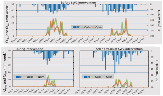 Effect of SWC interventions on discharge at the outlet of the 95 ha Debre Mawi sub-watershed (RF: rainfall, Qobs: observed discharge and Qsim: simulated discharge).
