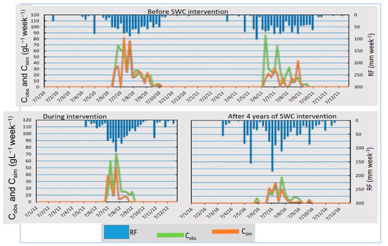 Impact of SWC interventions on sediment concentration (RF: rainfall, Cobs and Csim are observed and simulated sediment concentration).