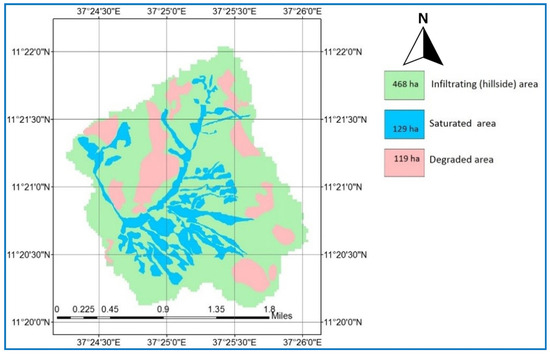 The experimental discharge and sediment concentration data of the 95 ha sub-catchment of Debre Mawi are upscaled to the catchment scale in the 716 ha Debre Mawi by combining the PED hydrology and erosion model with ArcGIS tools. In 2016, the saturated, degraded and hillside area fractions were 18, 17 and 65%, respectively, for the 716-ha Debre Mawi delineated from Google Earth and the field observation for the entire 716-ha Debra Mawi watershed (Figure 4). These percentage areas differ from those in Table 1 because the 95-ha subwatershed was located in the upper watershed (Figure 1), where we expect less saturation than in the upper part. Moreover, SWC practices were only implemented in the headwaters.