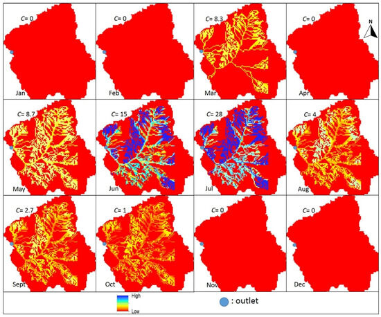 With the area fractions for the 716-ha Debre Mawi (depicted in Figure 4) and the remaining parameters of the hydrology and erosion model parameter sets for 2016 in Table 1, the combined PED-ArcGIS model simulated the catchment-scale spatial and temporal variability of storm flow (Figure 5) and sediment concentration (Figure 6) for 2016. The yellow and blue shades in Figure 5 illustrate where the storm flow occurred in the watershed. The red regions did not have storm flow. The highest monthly flow occurred in July, followed by August, May, September, October and June. Some storm flow was generated in March from the degraded lands (Figure 5) due to 74 mm of rainfall. The rainfall was less than 1 mm in January, February and April.