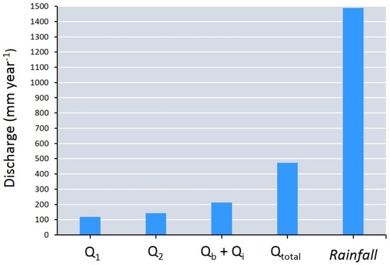 The 2016 annual rainfall and discharge produced by the present area fractions of the three watershed regions (Q1: runoff from area 1, saturated area; Q2: runoff from area 2, degraded area and Qb + Qi: sum of base flow and interflow generated by area 3, hillside).