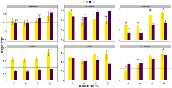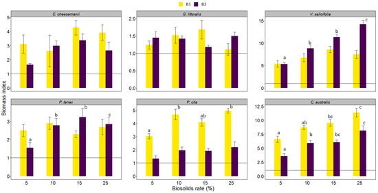 Biomass index of species versus increasing rates of biosolids from biosolid 1 and 2 (B1 and B2). Results show the average and standard error of the mean. The biomass index of control in dicated on the Y axis (y = 1). Letters over bars represent significant differences among the ratios for each treatment (n = 6). Note: The Y-axes are in different scales to visualise data patterns.