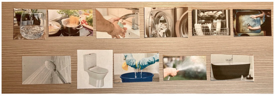 Visual research methods, including the use of photographs, are particularly effective for studying the everyday [48,49]. By showing the photographs to respondents, the taken for granted water practices were made visible, enabling a reflection and conversation on these activities in a manner that would be more difficult in a solely verbal interview [48]. The use of these photos also provided respondents with increased focus. It gave them a greater role in the interview and more freedom to address certain topics that the researcher might not normally raise [49]. During the interviews, respondents were asked to arrange the photos according to the importance they attached to the practices and encouraged to explain this ordering via the following question: Why is this practice important in your life and what values do you attach to it? Figure 1 shows one example of a ranking of practices.