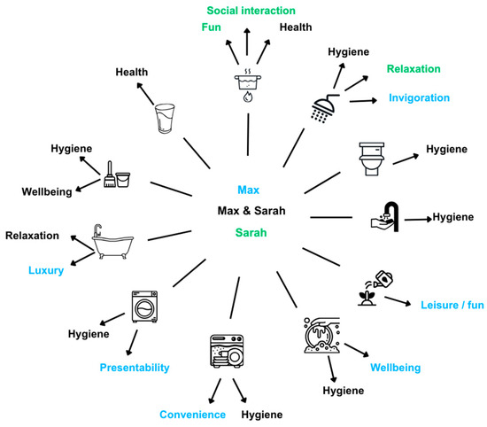 As illustrated in Figure 2, Max and Sarah’s water practices predominantly emphasize the value of hygiene. Max and other participants consider it important to keep themselves and their surroundings clean. Key practices involve personal hygiene, encompassing washing hands at the sink, and washing the rest of the body at the sink, in the shower or in the bath, and cleanliness of surroundings, including cleaning, using the washing machine or the dishwasher, washing dishes by hand, and flushing the toilet. Personal hygiene seems to be considered more important than the hygiene of the house, dishes, or clothes, indicating the significance of proximity to the body: