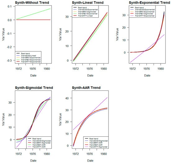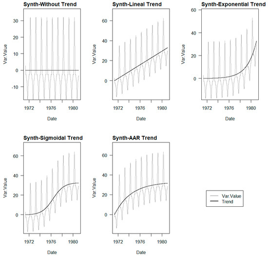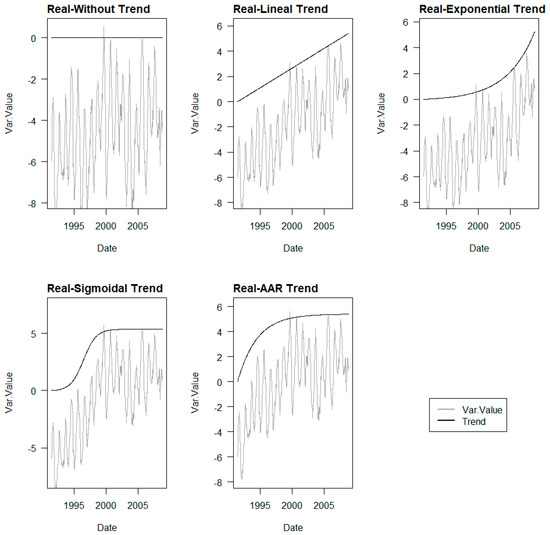 As indicated, to evaluate the trend identification capability of the different ML methods analysed, it is necessary to have series where the trend is known. To achieve this, the approach is to create stationary series to which the irreversible term of the predefined trend is added, thus creating time series with known trends.