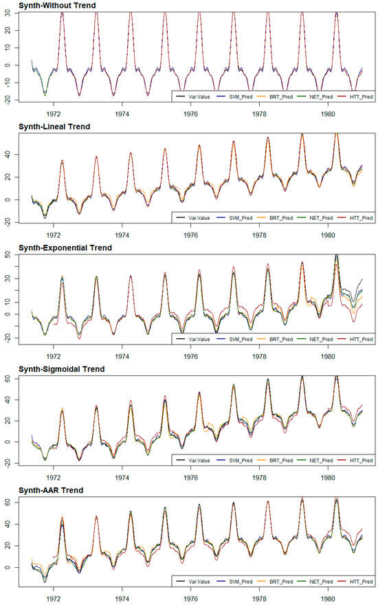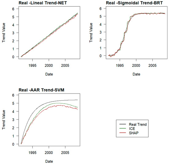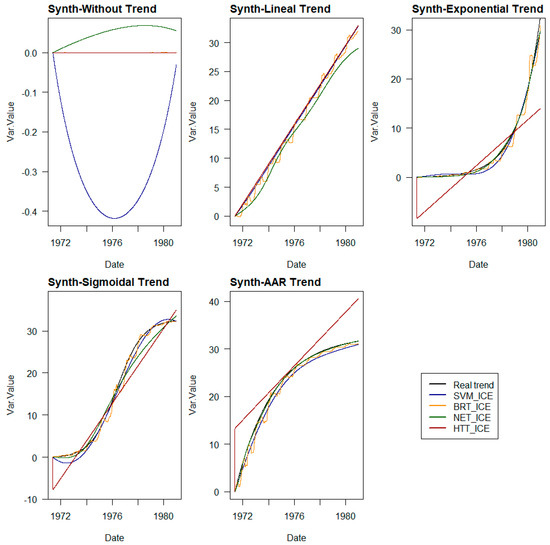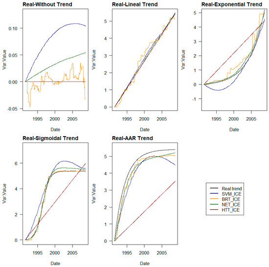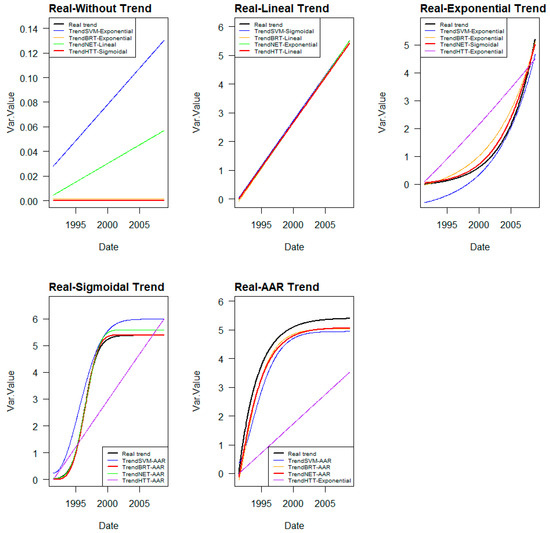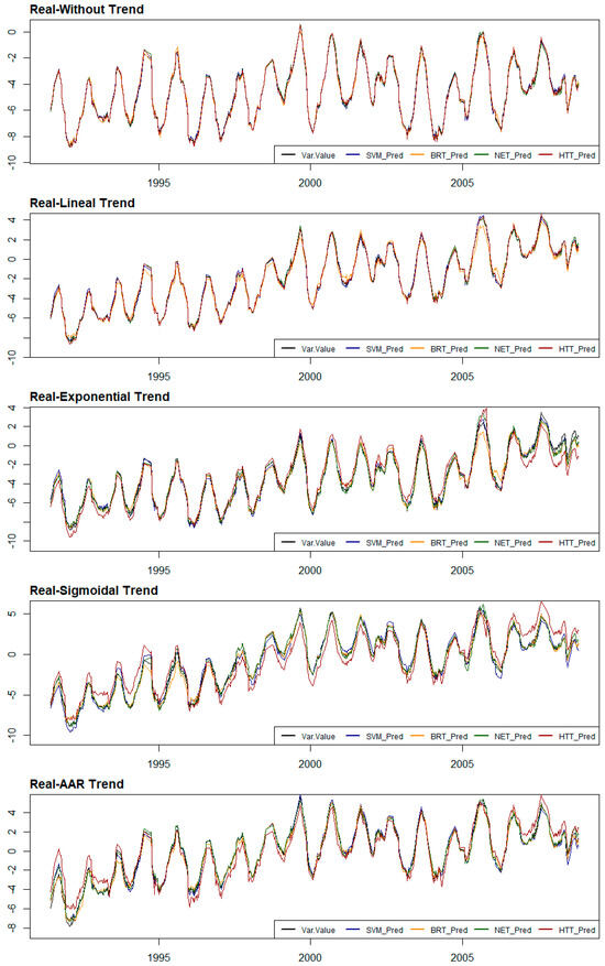 The ML models that provide better approximations to real trends, outside of cases without trends or with linear trends, are BRT and neural networks. Although the overall accuracy of SVM models is not much worse than that of the others, it is penalised by the interpretations it makes at the ends of the prediction series.