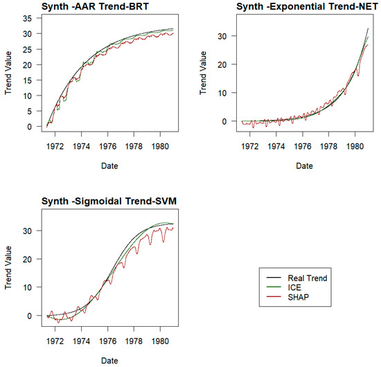 Experiments conducted on pure synthetic series and series based on the real behaviour of radial movements of a pendulum in a dam reveal that the partial dependencies of the response of ML models with respect to the time variable found using both ICE curves and SHAP values do indeed have a close relationship with the real trends artificially introduced in both phases of the study.