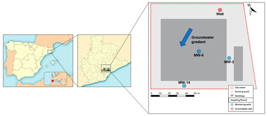 The Besòs River catchment, which supplies water to Barcelona (Spain) and discharges into the NW Mediterranean, is surrounded by many industrial areas. The surveyed area, spanning 15,300 m2, ceased its industrial operations three years ago, following a fire accident that triggered a spill. GW samples from this area were taken in February 2023. The GW’s direction of maximum hydraulic gradient is predominantly from the NE to the SW and its aquifer depth ranges from 5.5 to 6.5 m. This small plot of about one hectare is paved. It has a total of four wells: one GW well (Figure 1) and three monitoring wells (MW-2, MW-6, and MW-14). The area’s lithology consists mainly of silt with different proportions of sand and clay, depending on depth. Between 7 and 8 m depths, a very permeable layer of gravel with silty sand is present.