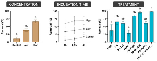 Comparison of eight novel treatment methods for the removal of TCE spiked to 100 µg/L in synthetic GW (Batch 1). Various concentrations of PS, Fe(II), and Fe(VI) (0, 1, and 10 mM) and S-nZVI (0, 1, and 10 g/L) were tested (Control, Low, and High, respectively) at different incubation times (1, 2.5, and 5 h). Significant differences between samples, identified by different lower-case letters, were determined by a Friedman test with FDR correction for concentrations and treatments (p < 0.05) due to paired and non-parametric samples.