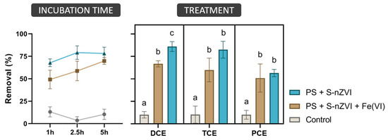 Additionally, 5 h reactions with unspiked GW demonstrated the removal of chlorinated solvents at low concentrations. As shown in Figure 4, TCE and PCE’s removals were around 73–94%. In the case of the unspiked GW samples, as DCE was not detected, no elimination was reported for this compound. Hence, this study has shown that a PS + S-nZVI treatment efficiently removes TCE and PCE statistically similarly.