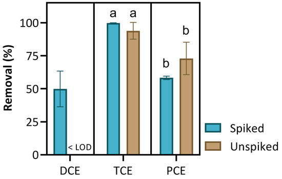 Removal of chlorinated solvents (DCE, TCE, and PCE) by a PS + S-nZVI treatment after a 5 h incubation time in spiked (10 µg/L each compound) and unspiked real Besòs GW and 10 mM of oxidant (Batch 3). Significant differences between the spiked and unspiked reactions’ removals within each compound, identified by different lower-case letters, were determined by a Friedman test with FDR correction for treatments (p < 0.05) due to paired and non-parametric samples. Since DCE was not detected in unspiked samples (0 nor 5 h), the statistical comparison had enough samples to be compared.