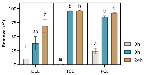 Removal of chlorinated solvents by PS + S-nZVI treatment at 0, 9, and 24 h of incubation in real Besòs GW spiked with 10 µg/L of each of the selected compounds (DCE, TCE, and PCE) and 10 mM of oxidant (Batch 4). Significant differences between different incubation times within each compound, identified by different lower-case letters, were determined by a Friedman test with FDR correction for the treatments of each compound (p < 0.05) due to paired and non-parametric samples.