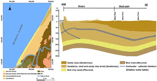 The geological composition of the Gharb region is characterized by schists and quartzites in the central plain, with a notable impermeable layer of “blue marls” acting as a barrier within the aquifer system [31]. Sedimentation patterns in the area have exhibited a regressive trend since the Pliocene era, marked by the deposition of lumachelles, sandstone, and conglomerates. Along the coastal zone, marine-derived Pelocene sediments, approximately 200 m thick, prevail. These sediments primarily consist of sands, sandstones, and calcareous sandstones, interspersed with thin layers of clayey silt (Figure 2). Sandy soils extensively cover the coastal zone of the Gharb Plain, encompassing around 39,000 hectares or 15% of the total area. These sandy soils significantly influence groundwater recharge and the overall hydrological behavior of the region [15].