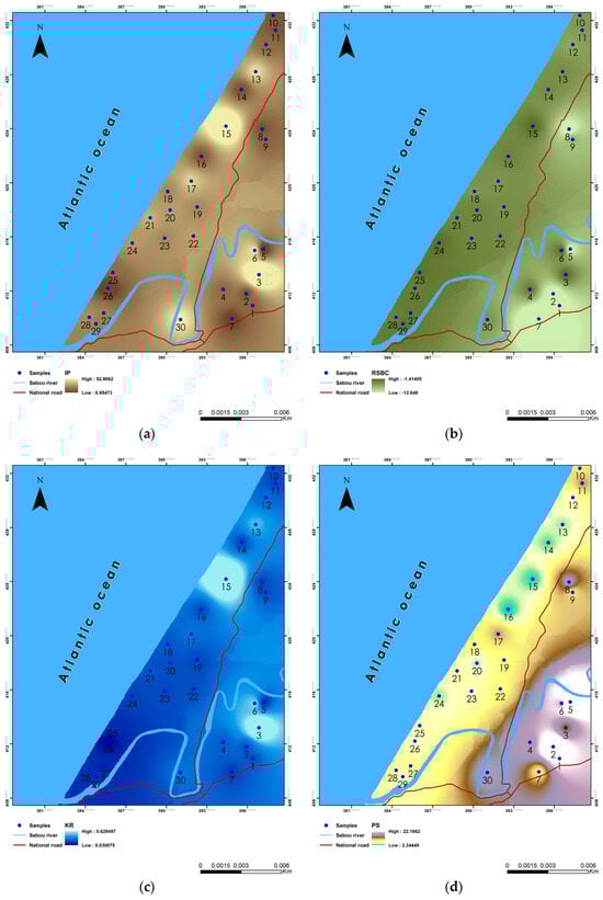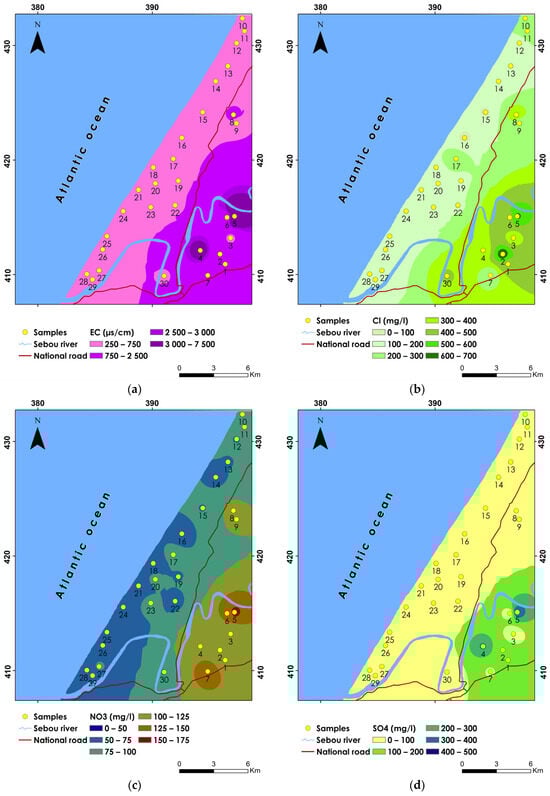 Spatial variation maps of (a) EC, (b) Cl−, (c) NO3+ and (d) SO42−.