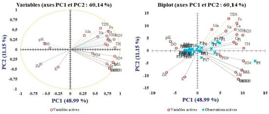 PCA serves as a valuable statistical tool in analyzing complex datasets containing a multiple of parameters with wide-ranging data. In PCA, the principal component loadings are categorized as strong, moderate, or weak, based on their absolute loading values: values exceeding 0.75 indicate strong loadings, those between 0.75 and 0.50 signify moderate loadings, and values ranging from 0.50 to 0.30 represent weak loadings [64]. In our study, PCA was applied to 22 physicochemical parameters, resulting in the identification of five principal components that collectively explain 85.03% of the total variance in the data (Table 9). Notably, the PC1—PC2 combination accounts for over 60.14% of the dataset’s variability (Figure 4), suggesting that the chemical evolution of groundwater is predominantly captured within these two components.