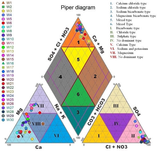 - Piper, A.M. A Graphic Procedure in the Geochemical Interpretation of Water-Analyses. Eos Trans. Am. Geophys. Union 1944, 25, 914–928. [Google Scholar] [CrossRef]