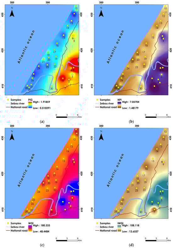 The spatial distribution maps of various physicochemical parameters were generated using GIS techniques and contouring methods with Arc-GIS 10.6. The spatial distribution maps for each parameter were prepared utilizing IDW interpolation techniques to illustrate variations across the study area. Furthermore, the PIG, NPI, WQI, and IWQI were elaborated upon based on these spatial distribution maps.