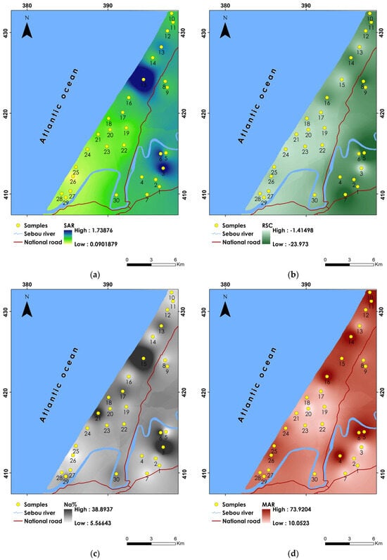 Residual Sodium Carbonate (RSC) gauges the harmful effects of carbonate and bicarbonate on groundwater quality for irrigation [42]. Elevated levels of carbonate, bicarbonate, calcium, and magnesium in groundwater can affect its suitability for crop cultivation [43].
