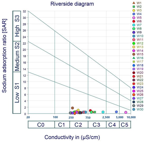 Irrigation water quality is further classified using an irrigation water classification diagram (USSL and Wilcox diagrams) based on standards from the U.S. Department of Agriculture [47,48]. The USSL diagram illustrates the relationship between EC and SAR, while the Wilcox diagram depicts the relationship between EC and %Na. The IWQI, developed using Equations (6) and (9) with variables EC, SAR, RSC, Na%, MAR, PI, RSBC, KR, and PS, weighs irrigation water quality requirements based on their importance for irrigation, as outlined in Table 6.