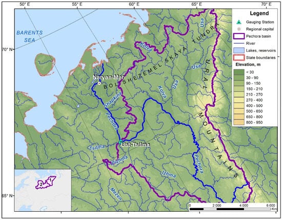 The Pechora River catchment lies in the northern taiga and tundra ecological zones. Permafrost is common in the north and northeast of the basin [38]. The mean annual air temperature is −3.3 °C, and the annual precipitation is 534 mm. A schematic map of the basin is given in Figure 1. Table 1 describes three major hydrological seasons of the river.