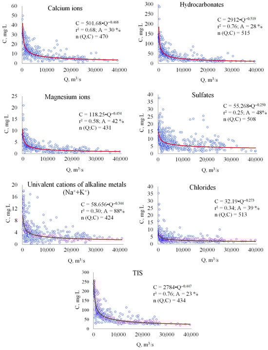 For pairs of water flow (Q) and the concentration of an individual ion (C), functional approximations were chosen to describe the relationship between the hydrochemical and water regimes (Figure 2). Note that, in low-flow phases, especially during the winter low-water season when the groundwater recharge of the river dominates, correlations between the concentrations of major ions and water discharge become much weaker. This contributes to an increase in the data approximation error inherent to chosen functions. Furthermore, during periods of lower water, the approximation error can be high because the water discharge is unchanged, but water TIS may vary widely due to the presence of waters with different genetic histories. At the initiation of water level rise, the river channel is still mostly filled by subsoil water; subsequently, most of the channel water is formed by surface recharge. Hydrocarbonates and calcium are the key ions that determine the Pechora chemical runoff and, hence, the integral characteristic of river water TIS. For these key ions, the determination indices at a level of 0.68–0.76 allow the determination of relationships between the mean daily water discharge rate (Q, m3/s) and the measured concentration values (C) to be stated the form C = f(Q). These can be considered as smoothing functions that reduce, to some extent, calculation errors due to errors in sampling, laboratory measurements, and input of results into databases, as well as other possible errors. The use of a unified approach for evaluating the runoff of major ions enables the identification of general regularities in variation during changes in long-term phases of water flow.
