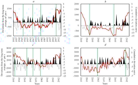 The time boundaries of the change in long-term phases (with a duration of 10 years or more) of increased and decreased water flow were determined by identifying the minimal and maximal values of coordinates in cumulative deviation curves; such methods have been widely used [19,22,50,51].
