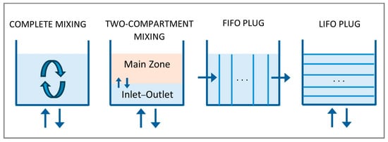 Epanet 2.2 implements four different types of models to characterise mixing within storage tanks [7], as presented in Figure 1. In this case, it is assumed that elements behave ideally, with clearly defined preferential paths and stagnation zones. When modelling a tank with Epanet, the objective is to select the mixing model that best represents reality.