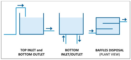 When determining the mixing model that best simulates the real behaviour of WQ in a tank, several aspects need to be considered. Firstly, it is important to note that the different models available in Epanet 2.2 aim to reproduce the interaction between inlet/outlet volumes with the stored volume for each time interval. All of these models are dependent on the inlet/outlet pipe disposal, tank geometry, and baffle configuration to guide the flows inside the tank if present, as shown in Figure 2.