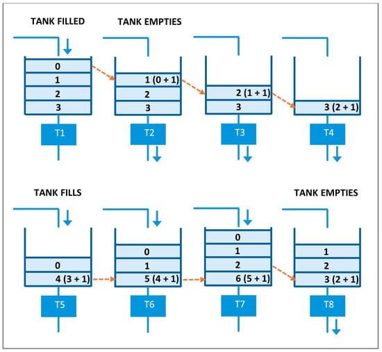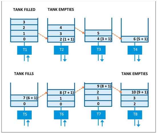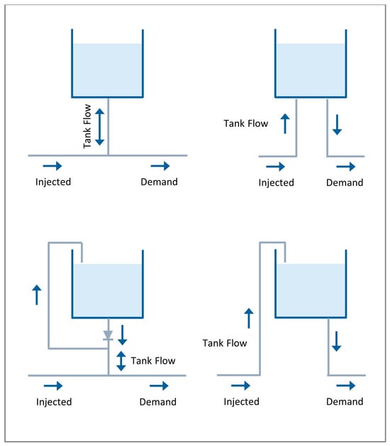 Note that the presented tank configuration, with a single-pipe connection to the network, does not allow for simultaneous inlet and outlet flows to the tank. Therefore, the tank fills when the injected flow is higher than the demand flow and empties when the injected flow is lower than the demand flow.