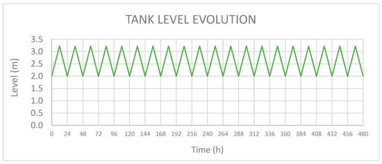 To achieve accurate and coherent simulation results when developing a WQ model of a network, it is necessary to first model the hydraulic behaviour properly and allow enough simulation time for all hydraulic and quality results to stabilise, reaching cyclic behaviour as shown in Figure 4 and Figure 5. This includes pressures, tank levels, flows, and water age. At this stage, the control laws for the regulating elements of the network, including the initial levels of tanks, must be adjusted to match the values at which they repeat after a certain simulation time.
