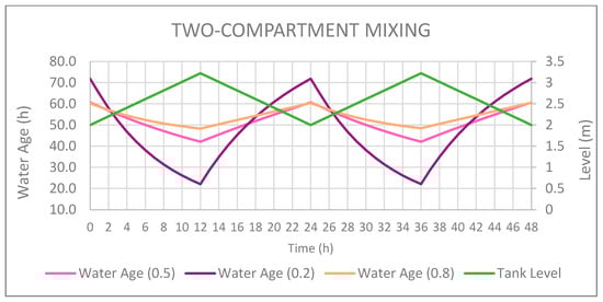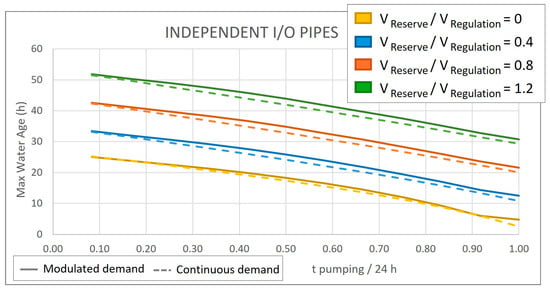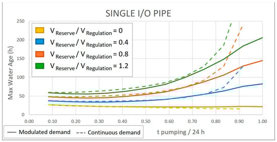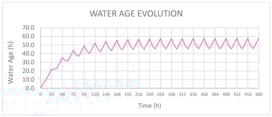 The maximum water age is 57.7 h, which coincides with the renewal time of all stored volume according to (1), i.e., approximately 2.5 days. This same value can be obtained from Figure 6 for tsupply/24 = 0.5, VReserve/VSupplied = 2125/2/(30 × 12 × 3.6) ≈ 0.8, and constant demand.