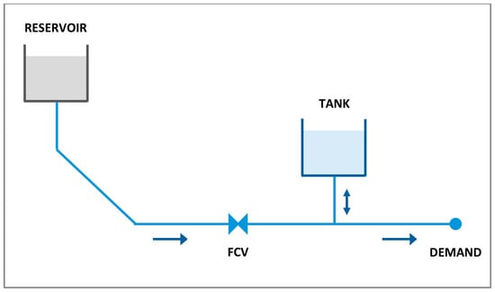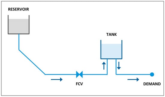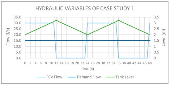 There is a continuous demand node of 15 L/s. The whole system is fed in 12 h by a flow of 30 L/s coming from an upper reservoir and controlled by a flow control valve (FCV), resulting in a daily average flow to the balance tank of 0.