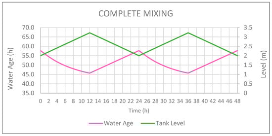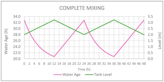 In complete mixing, all the water that enters the tank fully mixes with the water already inside. Figure 11 shows that as the tank fills, new water with a low water age enters the tank, so the water age decreases. Conversely, when the tank is being emptied, the water age increases as the stored volume keeps ageing.