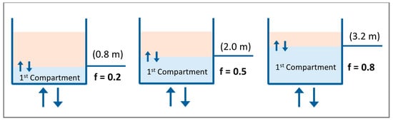 The results obtained for a mixing fraction of 0.5 and 0.8 are similar to those obtained for complete mixing. This is because the mixing fraction is related to the total volume (max. level of 4 m) and not to the actual volume used (max. level of 3.2), as depicted in Figure 13, so all the used volume is mostly or totally located in the first compartment.