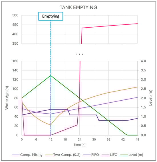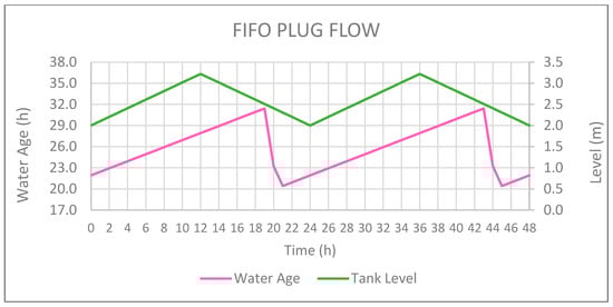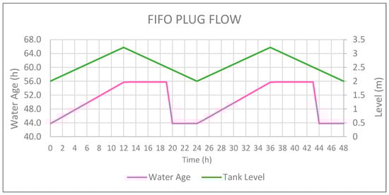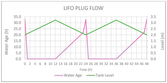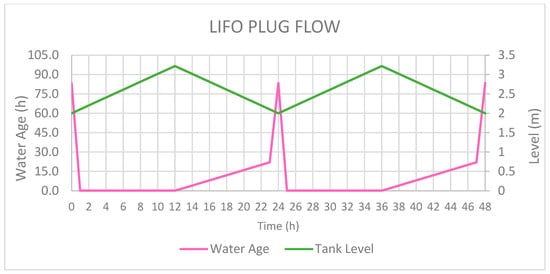 The LIFO plug flow model has the smallest water age evolution. However, at the top, a remnant remains whose age increases and becomes visible when it is consumed, for example, when the tank is emptied, as shown in Section 4.