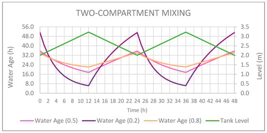 Two-compartment mixing: evolution of tank level and water age for three mixing fractions.