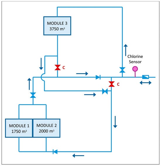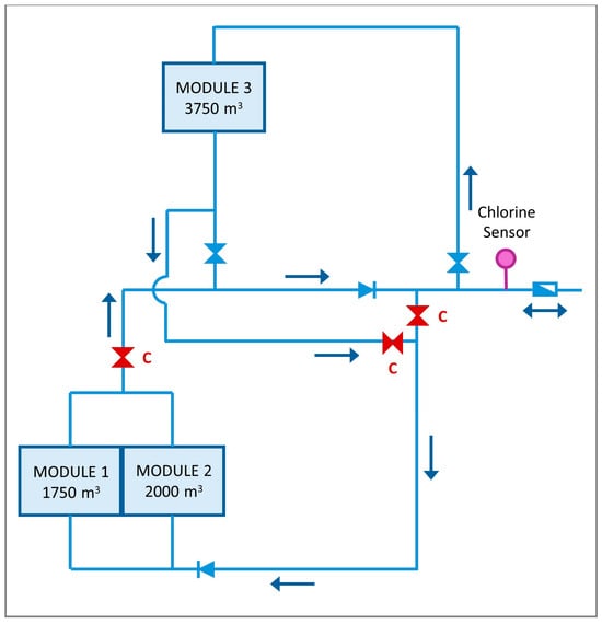The chlorine evolution in the tank was experimentally determined by isolating Module 3 in the first phase. Module 3 has a higher capacity of 3750 m3 and was used to obtain the chlorine concentration at the outlet of Module 3, which will be the inlet of Modules 1 and 2 in the second phase, from which water returns to the network. The evolution of chlorine in Modules 1 and 2, which are located in parallel with volumes of 1750 and 2000 m3, respectively, was finally obtained.