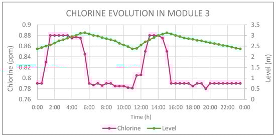 The analysis of Module 3 indicates that the chlorine value decreases by approximately 0.1 ppm compared to the input value. No fluctuations are observed, resulting in a constant chlorine value.