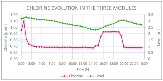 After studying Module 3 independently, the chlorine evolution at the pipe connection to the rest of the network was analysed with all modules in operation in order to characterise the chlorine evolution at Modules 1 and 2.