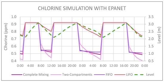 Simulated chlorine evolution for all mixing models available in Epanet.
