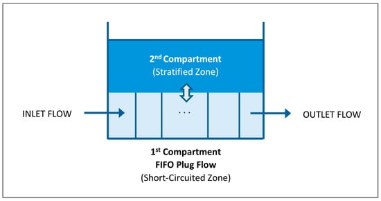 In two-compartment mixing, the total available storage volume of the tank is divided into two compartments, both of which are assumed to be completely mixed. The inlet/outlet pipes of the tank are located in the first compartment.