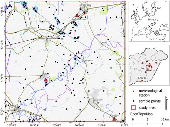 Minimum, maximum, and mean temperature; window speed; relative humidity; global radiation; elevation; and latitude information at each measurement station were downloaded from the OMSZ database. Nine meteorological stations were identified within a 40 km buffer around our research area (Figure 1). The number of stations beyond the study area needed to be extended, because only three stations fall within the original study area, which proved insufficient for the generation of continuous maps of meteorological data. Furthermore, the extension accommodated the continuous nature of interpolation calculations. Potential evapotranspiration (PET) values were calculated using the Penman method implemented in the pyet Python package [47]. The Penman method is a combination method, in which the total evaporation rate is calculated by weighing the evaporation rate due to net radiation and the evaporation rate due to mass transfer [48]. The meteorological data from the nine stations were interpolated using the Inverse Distance Weighted method. Mean temperature, precipitation, PET, and wind speed maps were generated with a spatial resolution of 10 × 10 m.