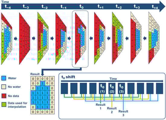 Figure 3 presents our methodology to create a continuous time series from the Sentinel-1- and -2-based water maps. If, on a certain date, no classified water map was available, an empty map was created at its place in the stack. During the next step, the algorithm evaluated the first map in the stack for pixels without data. If a pixel without data was found, the data of one day before (at t−1) and one day after (at t+1) were considered. If Xt−1 and Xt+1 were available, then Xt0 = [(Xt+1 + Xt−1) /2], where X is the value 0 (“no water”) or 1 (“water”) of the pixel, and Xt0 were rounded up to the closest integer. This means that, if there was water in the pixel before or after the date under consideration, the pixel was designated as “water”. If Xt−1 or Xt+1 were missing, Xt−2 and Xt+2 were considered. If data were still unavailable, another day earlier and/or later was considered, up until Xt−4 and /or Xt+4. If there was still no data available, the earlier and later water information were regarded as unreliable and the pixel was assigned as “no water”. After all no data pixels in the map were filled with either 0 or 1, the next date in the stack was considered, and so on, until all no data pixels in each daily water cover map were filled. Finally, a frequency map was created based on the complete time series. For each pixel, it was determined how many times water occurred and a relative frequency was calculated.