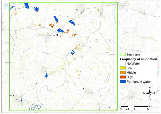 For each pixel in the study area, the frequency of inundation can be evaluated (Figure 4). The daily water maps show where and for how long the area was covered by water. Pixels with water coverage of >0.4 were designated as “Permanent water”, pixels with a frequency between 0.23 and 0.40 were classified as “high”, pixels with a frequency between 0.18 and 0.23 were classified as “middle”, and pixels less than 0.13 were designated as “low”. The permanent water surfaces are a good reflection of lakes, ponds, rivers, and canals with wider cross-sections in the study area. Areas of high inundation include poorly managed runoff areas such as former riverbeds. Rice paddies (square and rectangular shapes) also fall into this category, as they are covered by water for most of the year. Medium and low frequency areas are negligible. They usually mark the shallowest water sources or the edges of larger patches, which dry out or become re-covered with water over time.