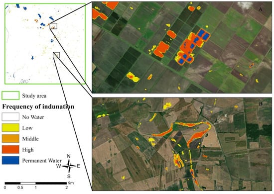 Figure 5 shows two examples of areas with a high frequency of IEW inundation. The shapes of the flooded rice fields are clearly visible in the upper map (A). There may be small patches classified as “Permanent water”, because these areas were under continuous water cover for most of the year. Another example is the accumulation of water in an old, buried, undrained riverbed (B). The deeper areas have a high frequency of water coverage, while the shallower areas are IEW areas with middle-to-low frequency.